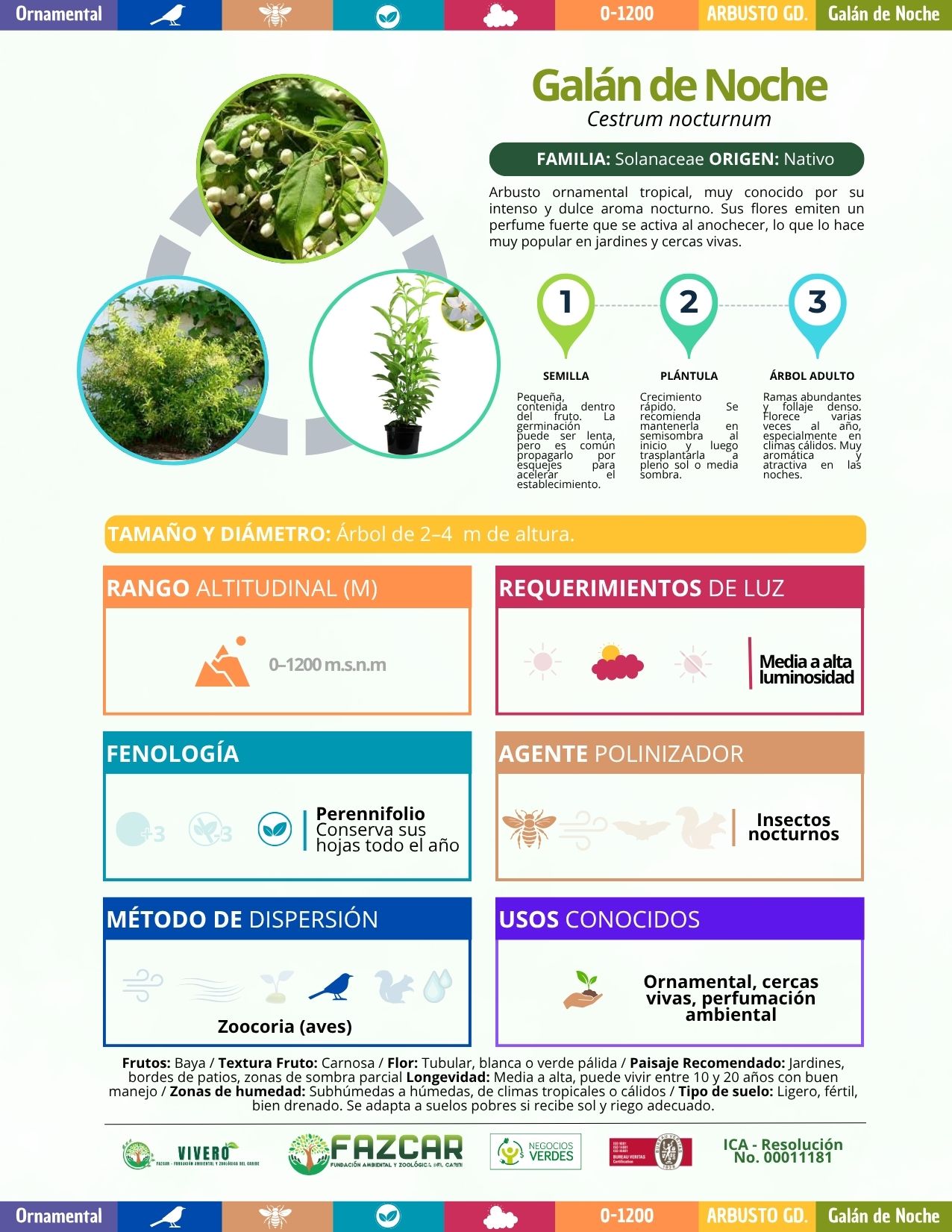 Arbusto tropical muy apreciado por su perfume dulce y penetrante que se libera al caer la noche. Su floración blanca o verdosa es constante en climas cálidos y húmedos. Ideal para jardines, setos y áreas de sombra parcial. Se desarrolla bien en suelos pobres y con buen drenaje.
