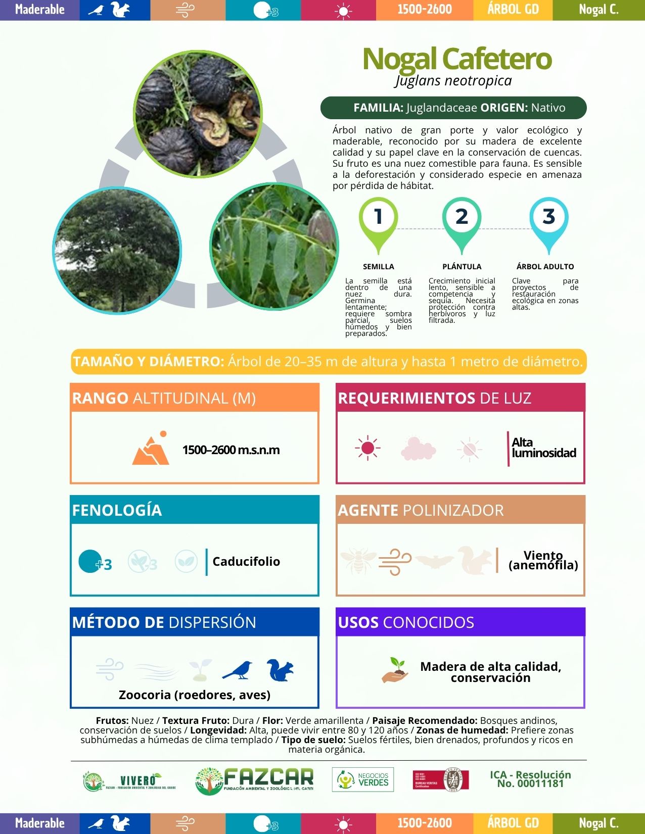 Árbol nativo de gran porte, valor ecológico y madera de excelente calidad. Su madera es reconocida por su durabilidad y su fruto, una nuez comestible para la fauna. Es sensible a la deforestación y considerado en amenaza por pérdida de hábitat. Ideal para la conservación de bosques andinos.