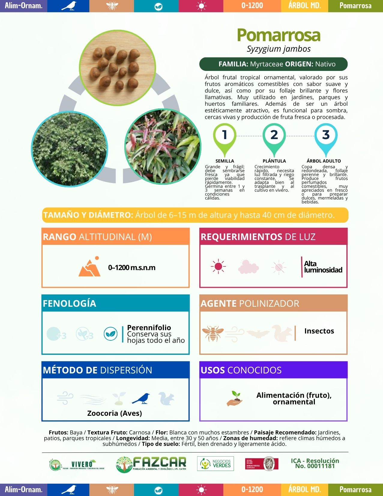 Árbol frutal tropical, valorado por sus frutos aromáticos comestibles con sabor suave y dulce. Su follaje es brillante y sus flores son llamativas, lo que lo hace muy utilizado en jardines, parques y huertos familiares como árbol ornamental y funcional. Es ideal para sombra, cercas vivas y producción de fruta fresca o procesada.